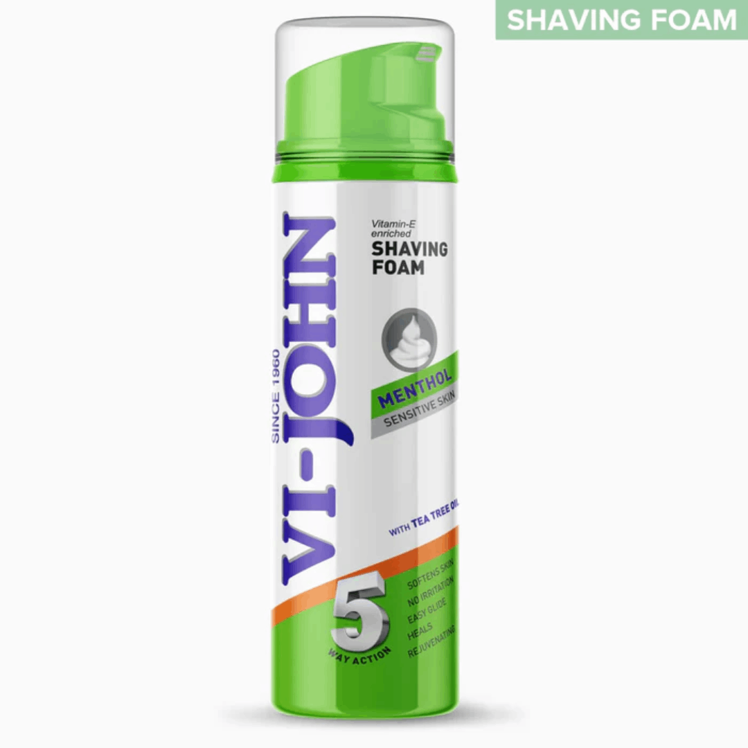 VI-JOHN 5-way Action Vitamin E Enriched Shaving Foam Menthol For Sensitive Skin is a rich buttery cool formula that helps to soothe and soften the facial hair facilitating a smooth shaving experience. No more cuts, nicks, or redness with this best shaving cream infused with tea tree oil and vitamin E. Vitamin E helps to retain skin moisture, protects cells from getting damaged, and softens skin while tea tree oil helps to soothe skin and diminish redness post shaving. The fresh mild aroma post-use will keep you fresh all day long. Don’t forget to use a good razor with a stainless-steel blade for the best shave.